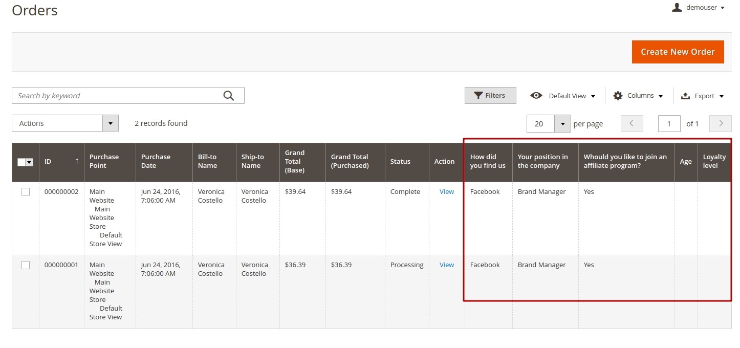 Moreover, every newly created characteristic can be shown on the Order View Page and Customer Information page, as well as in Customers and Orders grids in the backend: