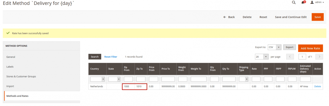 One more option to decrease the number of shipping methods, and hence improve your store performance, is to create methods related to geographical areas. To specify the area where a rate is applicable, just use Magento country codes or a postal code range as shown in the screenshot: