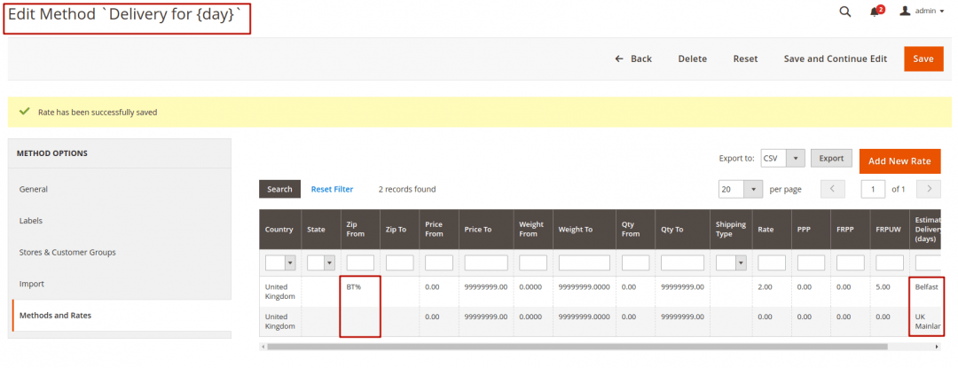 Suppose a customer’s postal code is BT1 2DF. It matches both rates with the BT% and ALL configurations. As the BT% group is a subset of All and it fits the customer’s address better, only the rate related to BT% will apply. Customers coming from outside Belfast will see rates as for UK mainland. This is how it looks like in Magento: