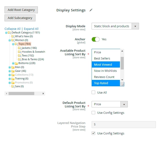 This module allows you to create a sorting filter by any product attribute. It makes customer navigation faster, so they can make the purchase as quickly as possible. Besides sorting by reviews, price, and most viewed products, you can add default sorting to a category page. So you can draw attention to new or best-selling products. To configure it, go to Catalog>Categories, choose the needed category, and open the Display Settings tab. In the Default Product Listing Sort By graph, choose the needed attribute: