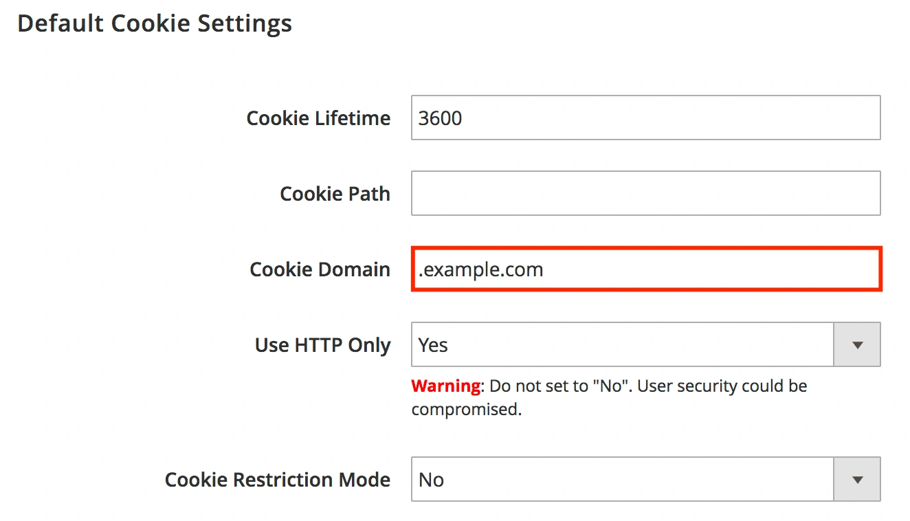 In our case, .example.com is correct while example.com is not. See below how an accurate setting looks like in Magento 2.