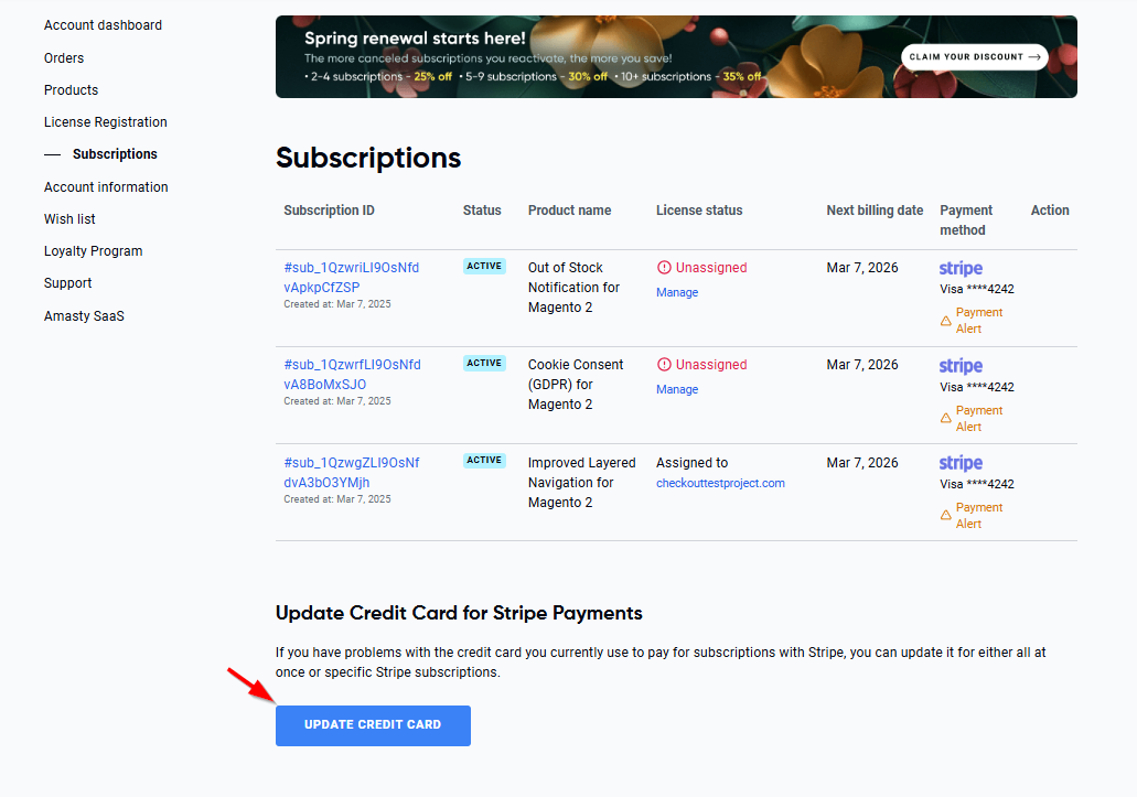 In the Active subscriptions grid, locate the subscription for which you want to update the payment method. Click on Update primary payment method.