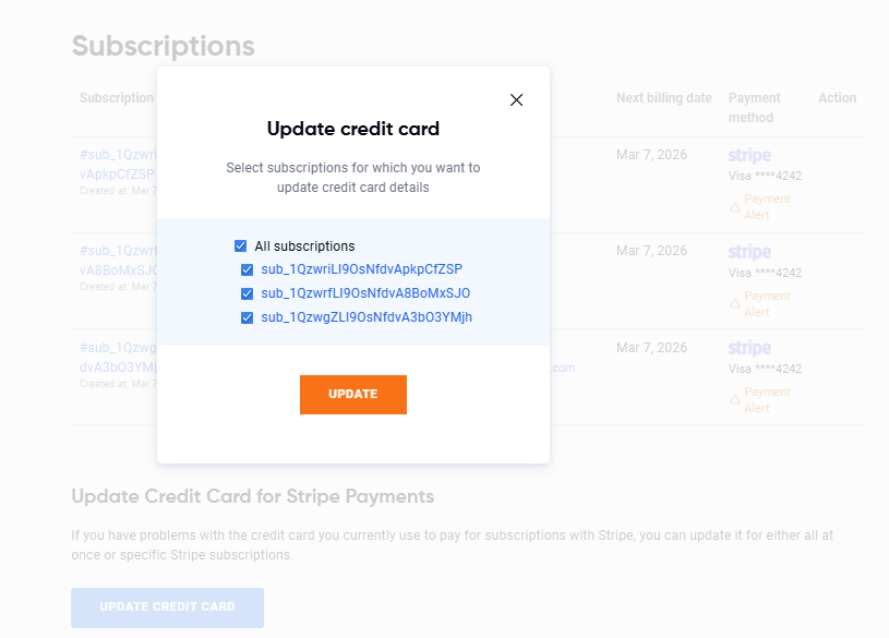 You can update the payment method for each subscription directly from the Active subscriptions grid.
