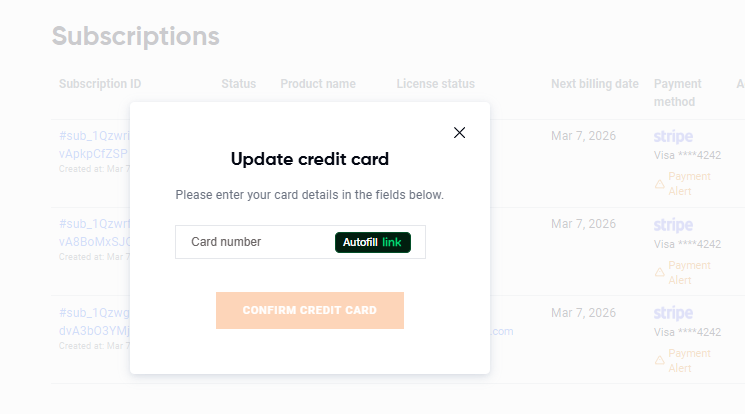 If you wish, you can also set this card as the primary card for all active subscriptions by locating the newly added card in the list, clicking on the action menu “⋯” next to it, and selecting Set as primary.