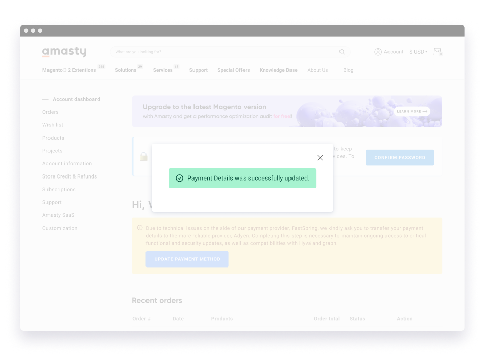 Due to technical issues with processing subscriptions on the side of our payment provider, FastSpring, please transfer your payment details in your customer accout to the more reliable provider, Adyen. Completing this step is necessary to maintain ongoing access to critical functional and security updates, as well as compatibilities with Hyvä and graph.